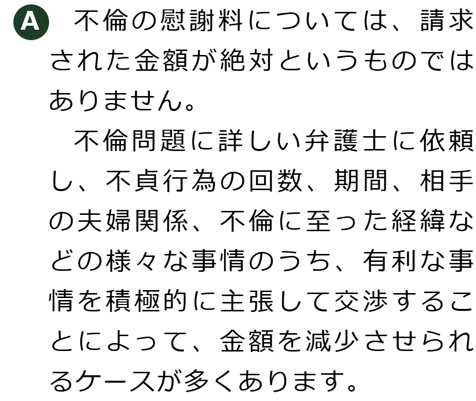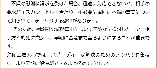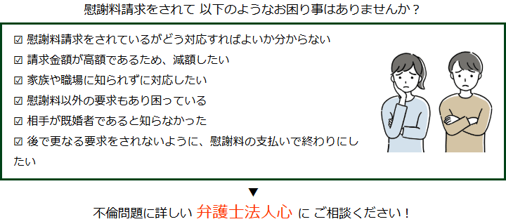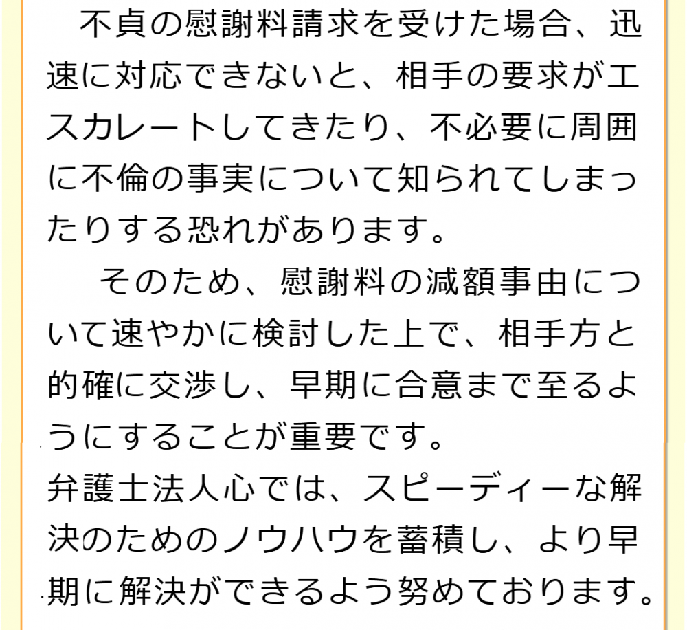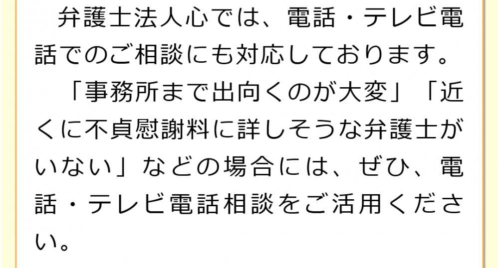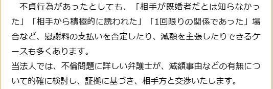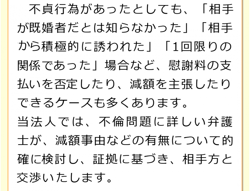 不倫慰謝料請求でお困りの方へ 閉じる 閉じる よくあるご質問 お問合せから解決までの流れ 受付時間 平日 9時~21時、土日祝 9時~18時夜間・土日祝の相談も対応します(要予約) 所在地 〒060-0808 北海道札幌市北区北八条西4‐1-1パストラルビルN8 2F (札幌弁護士会所属) 0120-41-2403 お問合せ・アクセス・地図