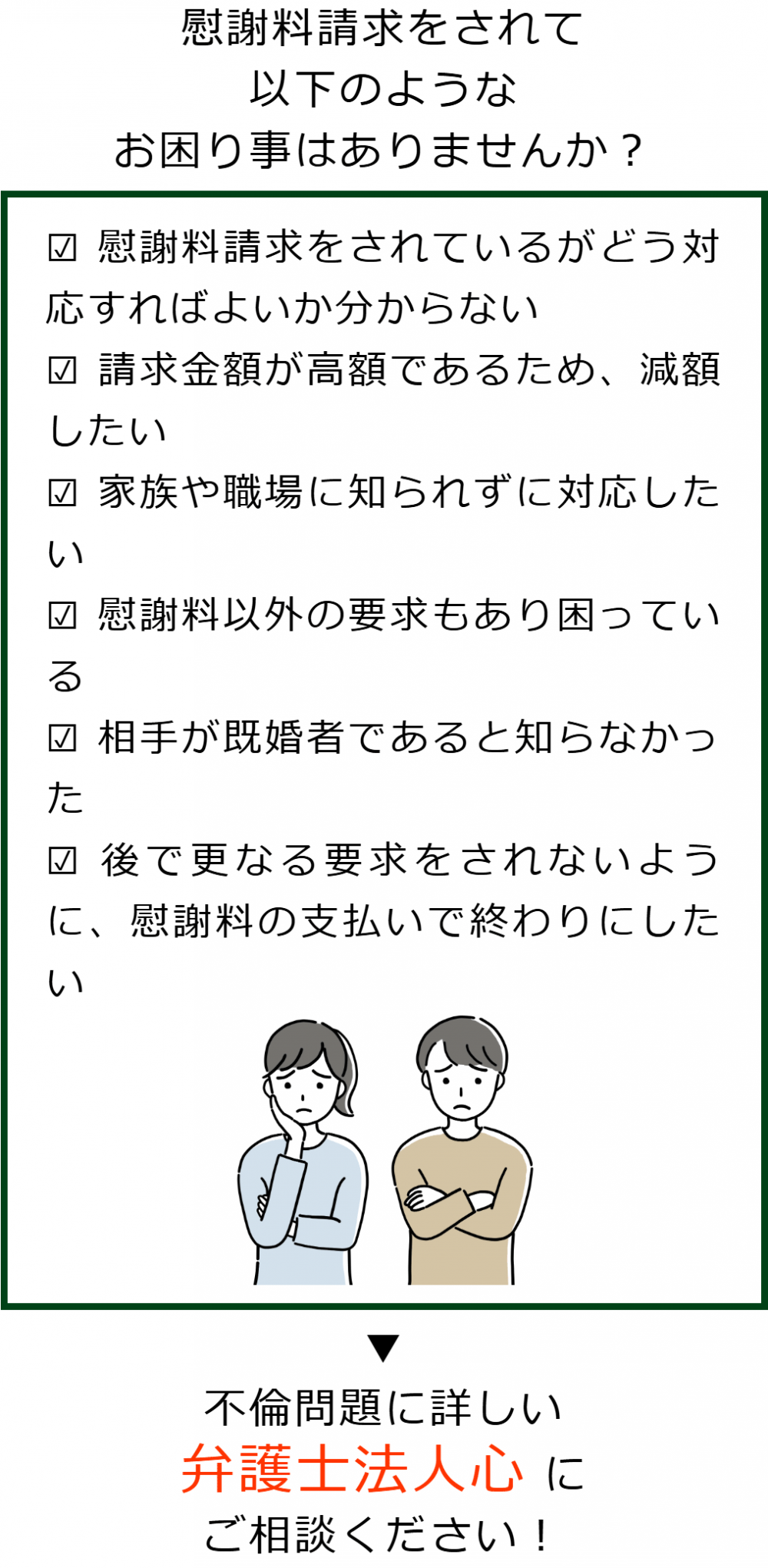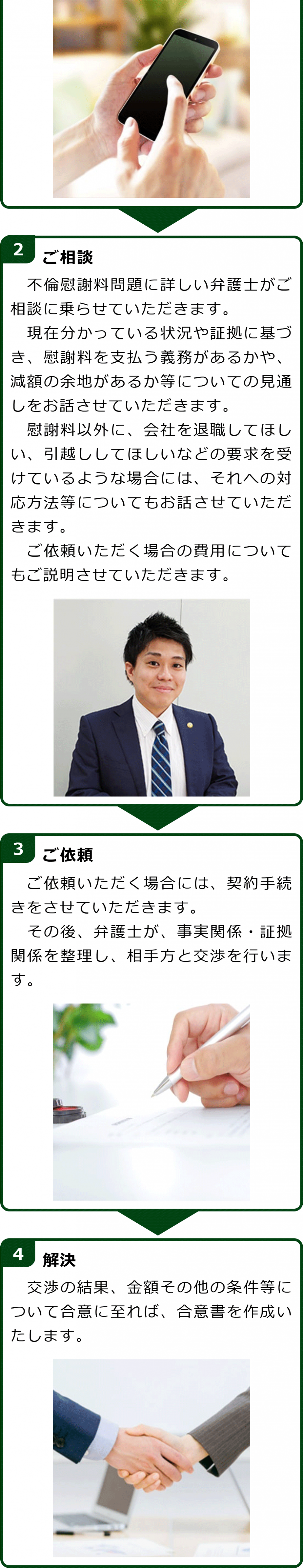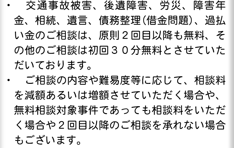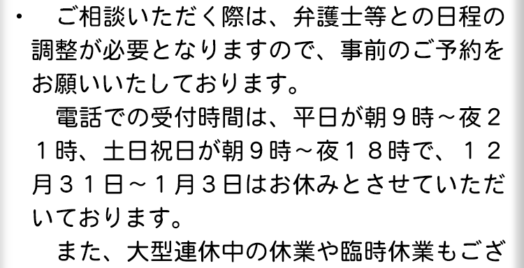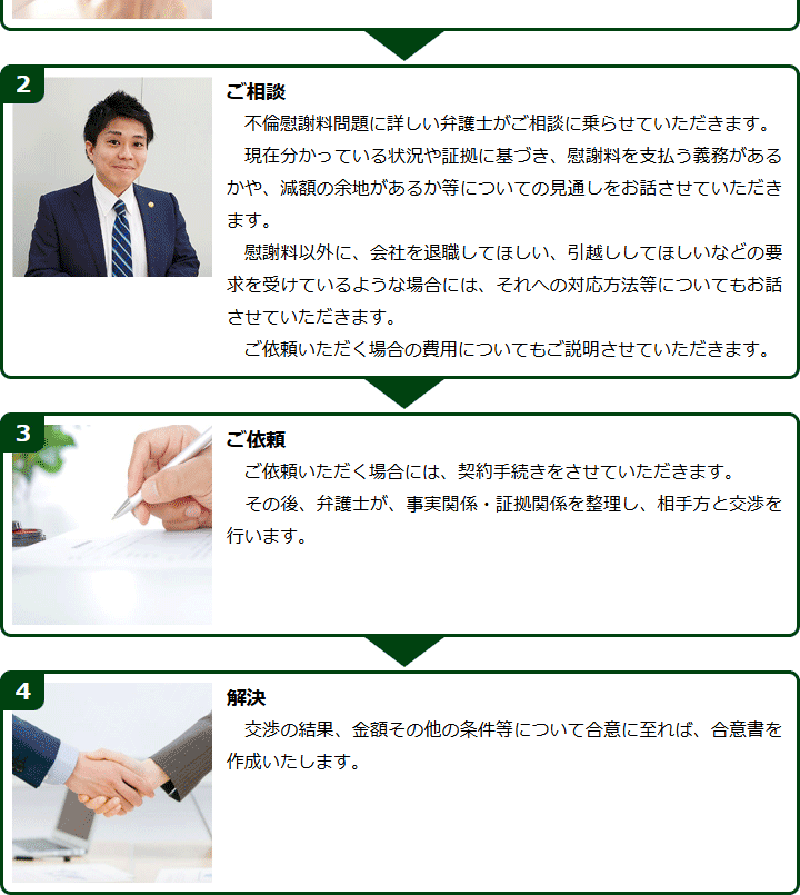 不倫慰謝料請求でお困りの方へ 閉じる 閉じる よくあるご質問 お問合せから解決までの流れ 受付時間 平日 9時~21時、土日祝 9時~18時夜間・土日祝の相談も対応します(要予約) 所在地 〒060-0808 北海道札幌市北区北八条西4‐1-1パストラルビルN8 2F (札幌弁護士会所属) 0120-41-2403 お問合せ・アクセス・地図
